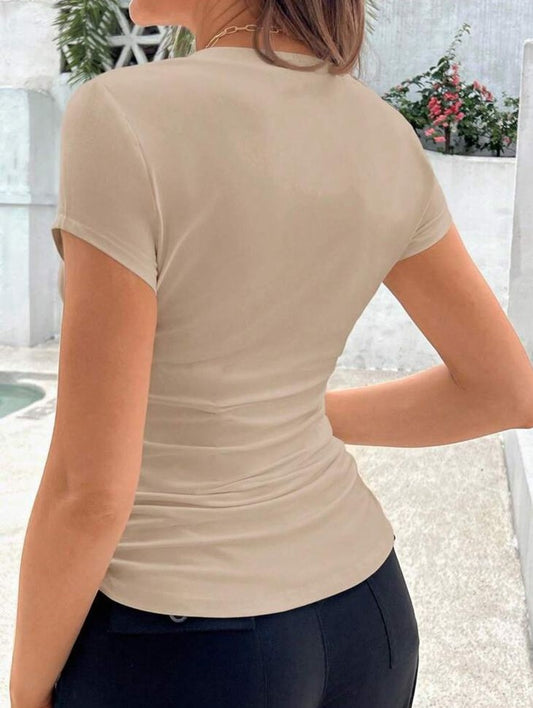 Maternity Solid V-Neck Pleated Short Sleeve T-Shirt