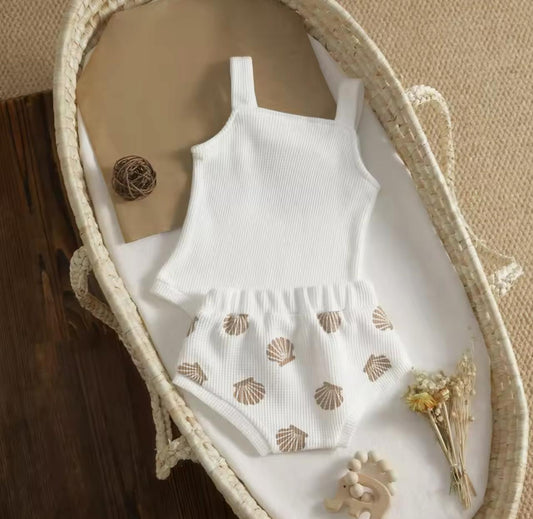 New Born Shell Print Strap Button Plaid Knitted Bodysuit & Short Set